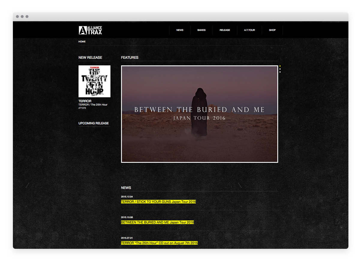 ALLIANCE TRAX is a Tokyo-based record label specialized in hard-core music. NSSG was responsible for the art direction and design for the official website.