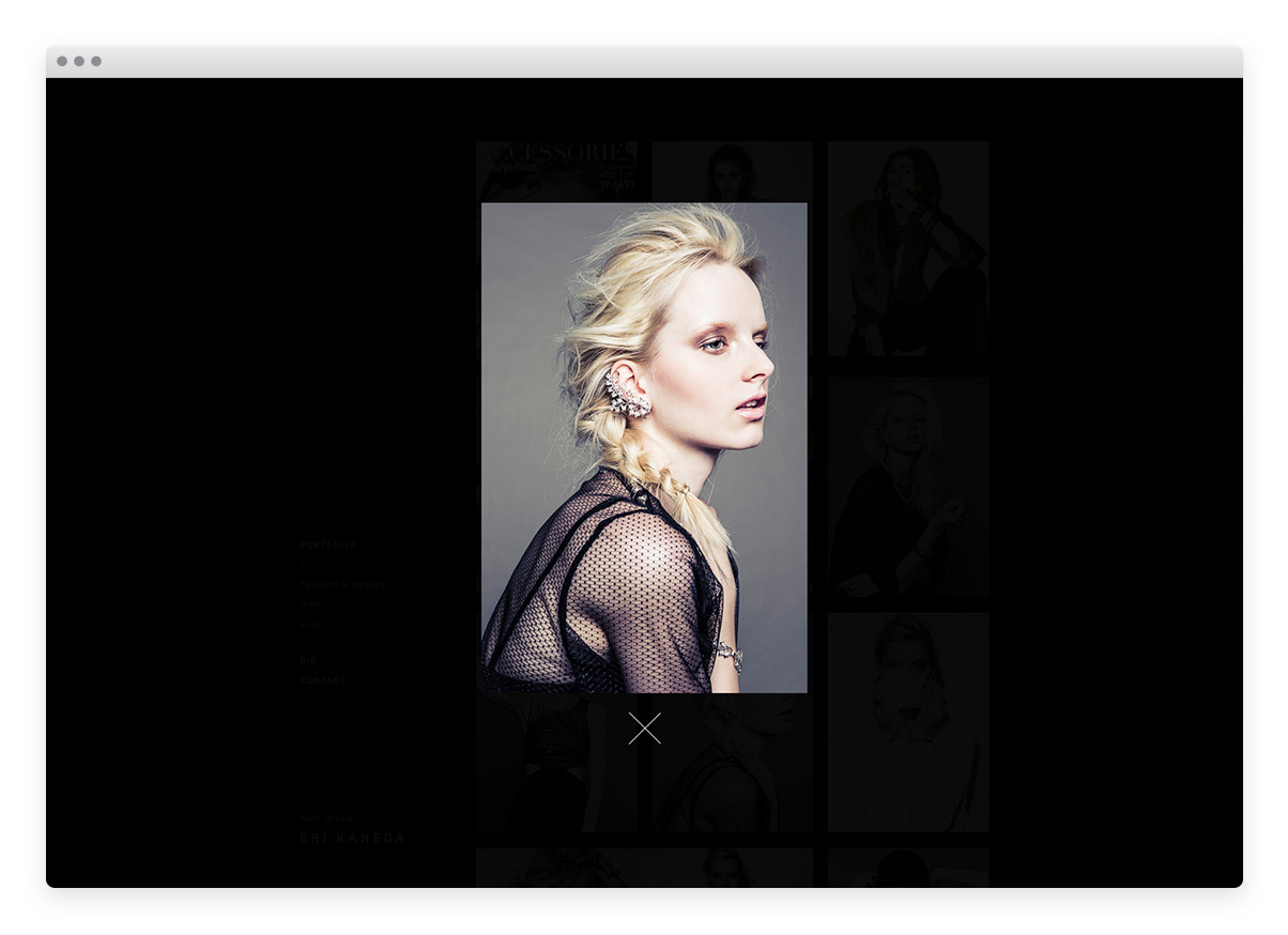 Eri Kaneda is an Osaka-based hair and make-up artist. NSSG was responsible for art direction and design for her portfolio website.
