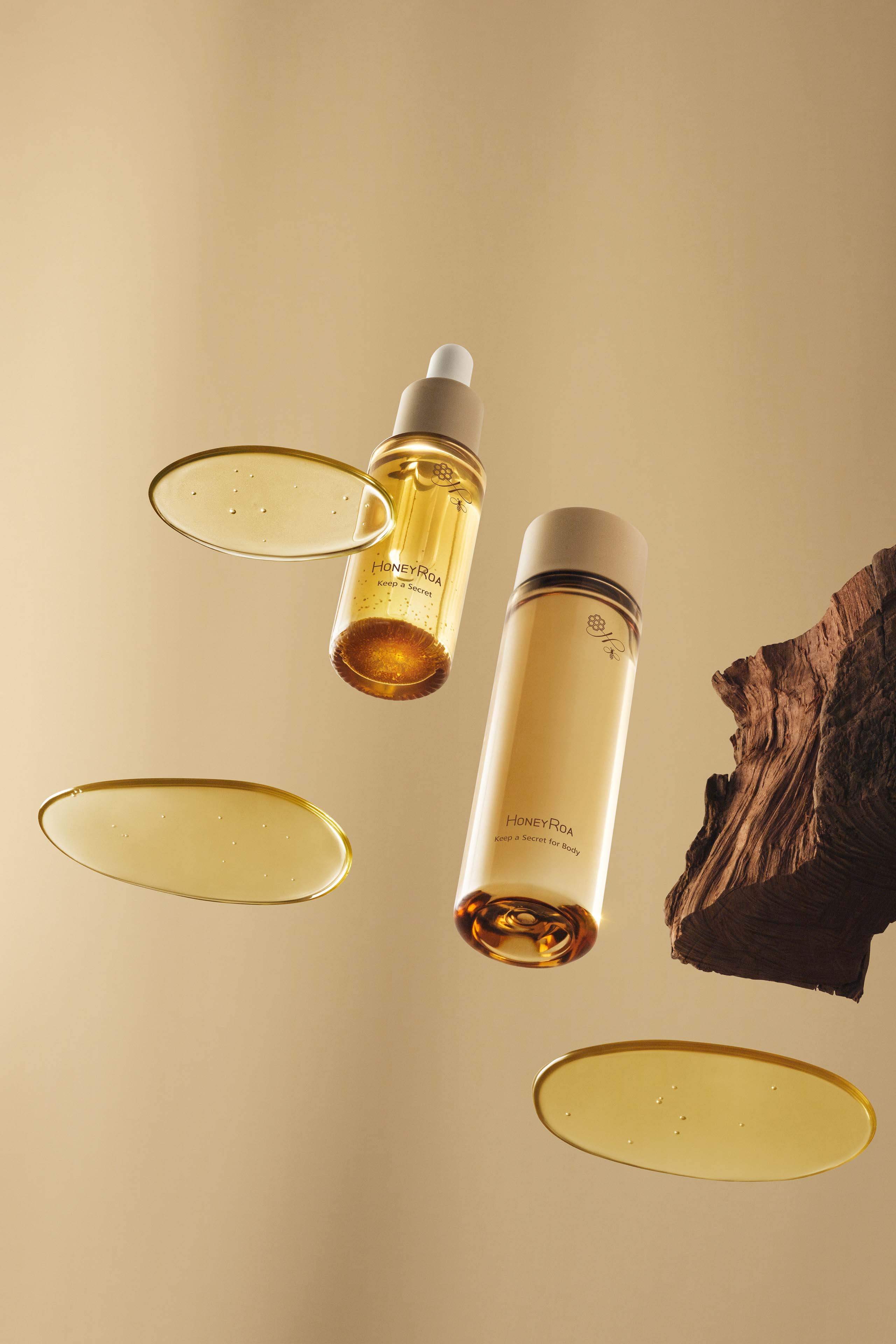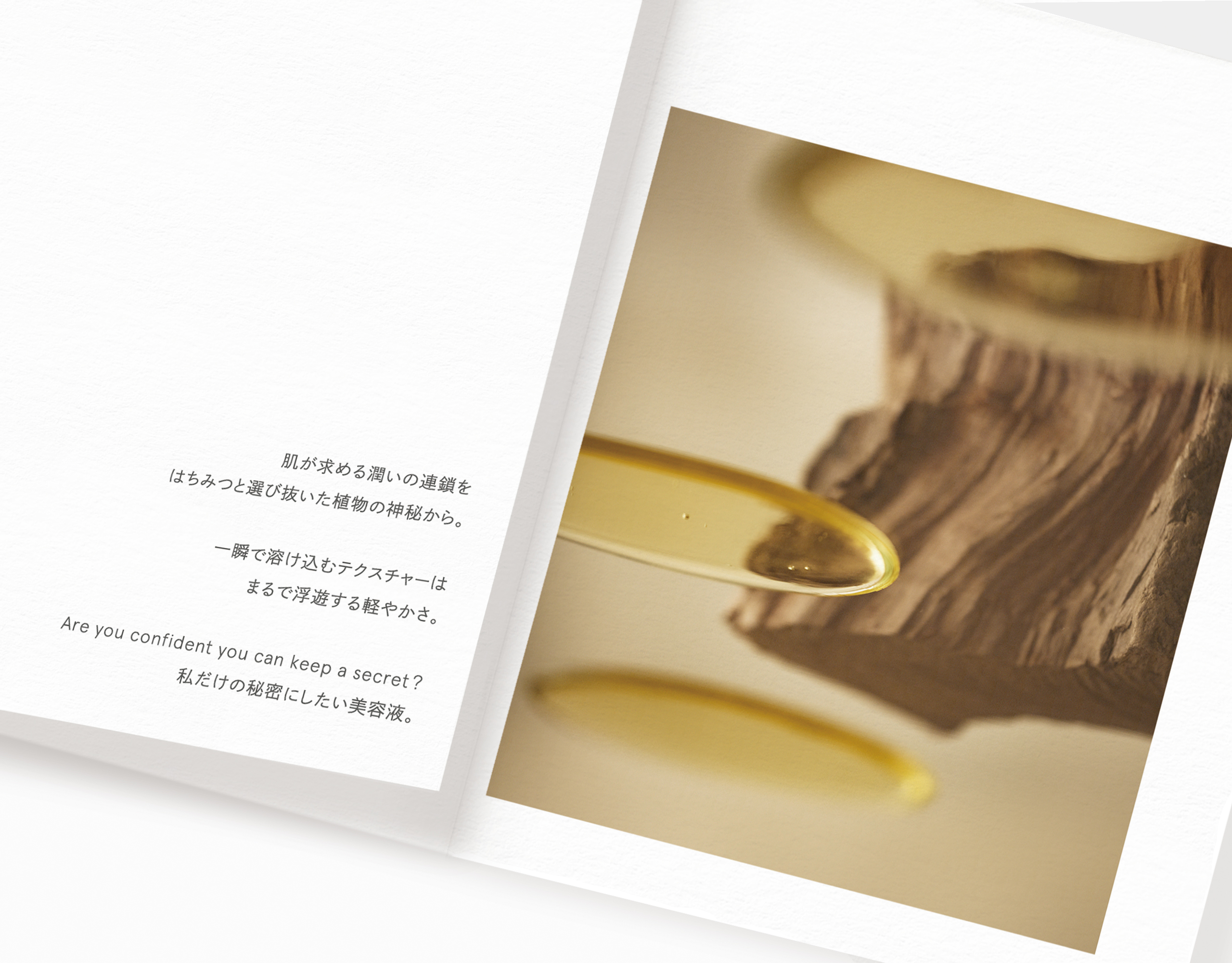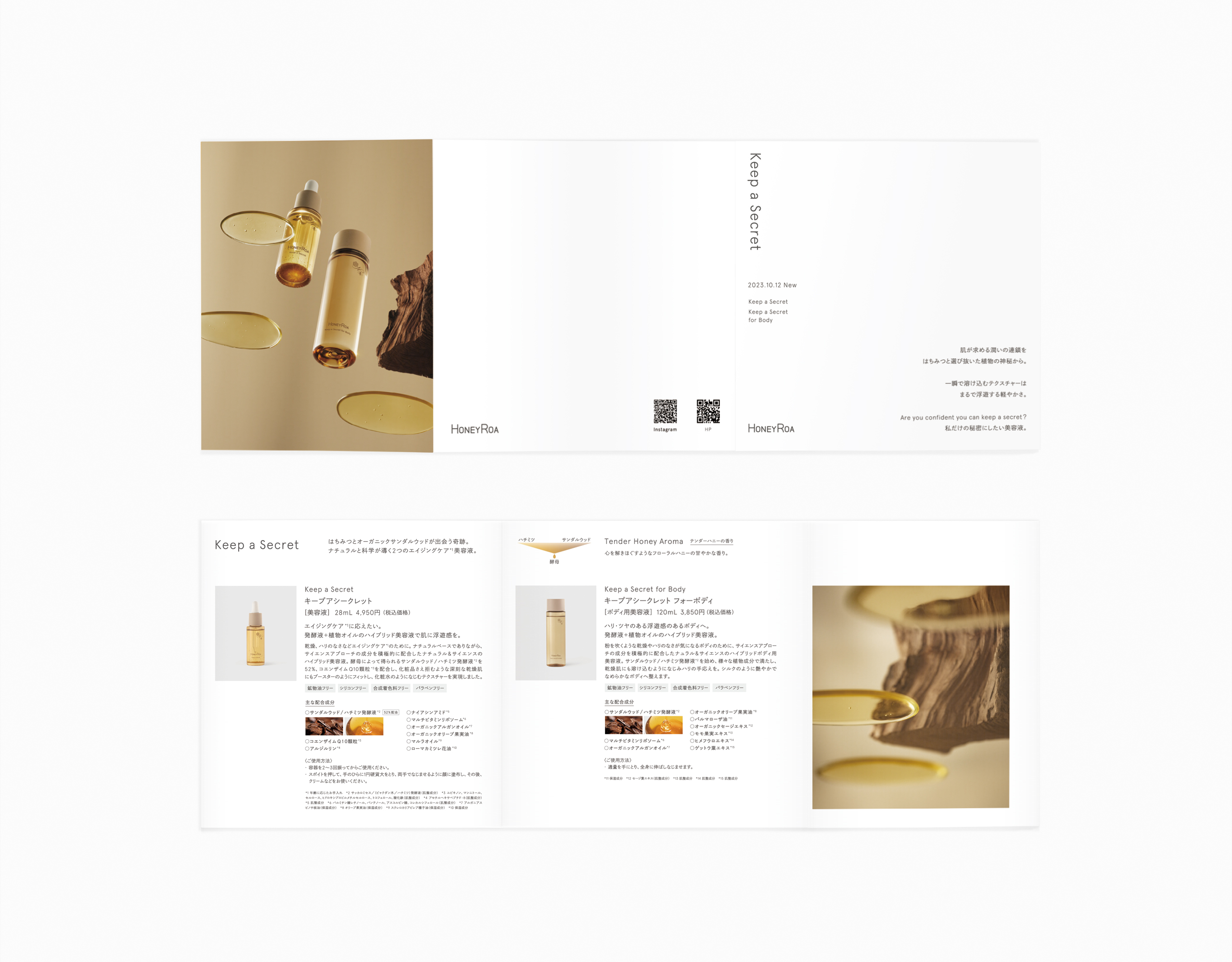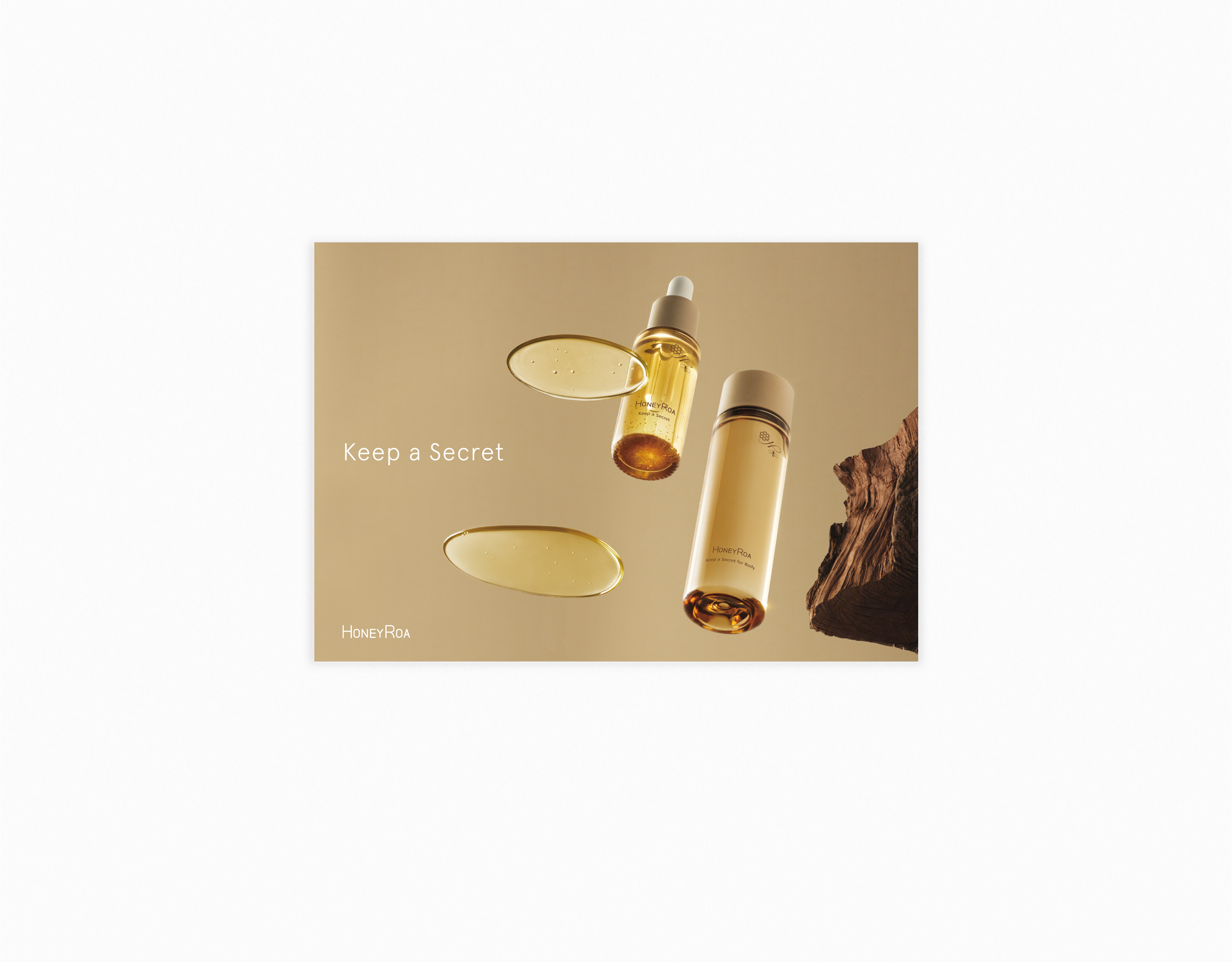 蜂蜜を使った化粧品やナチュラルなライフスタイルを提案するブランドHONEY ROA(ハニーロア)。新シリーズ Keep a Secretのビジュアルディレクションとパンフレット、店頭コルトンのデザインを担当いたしました。