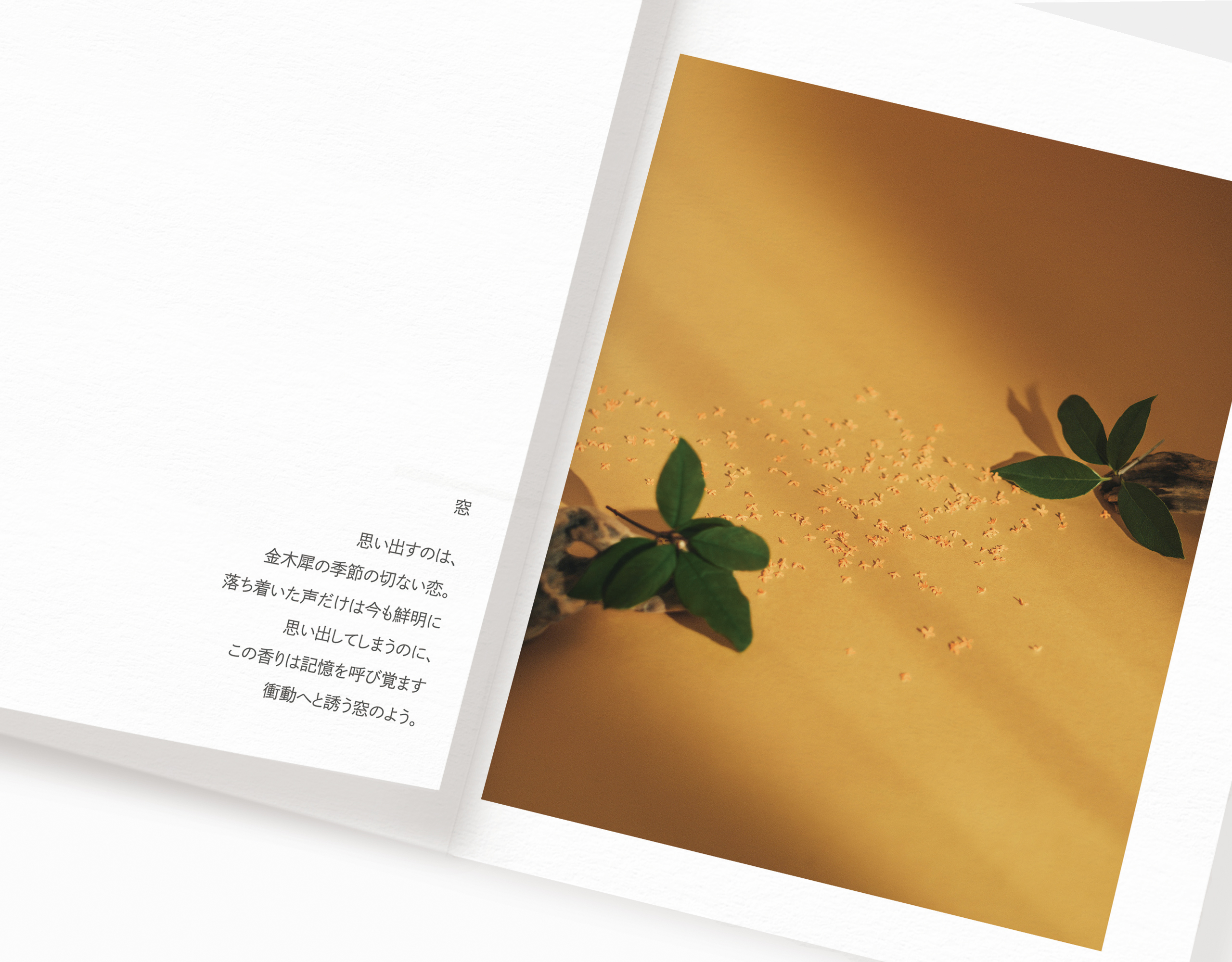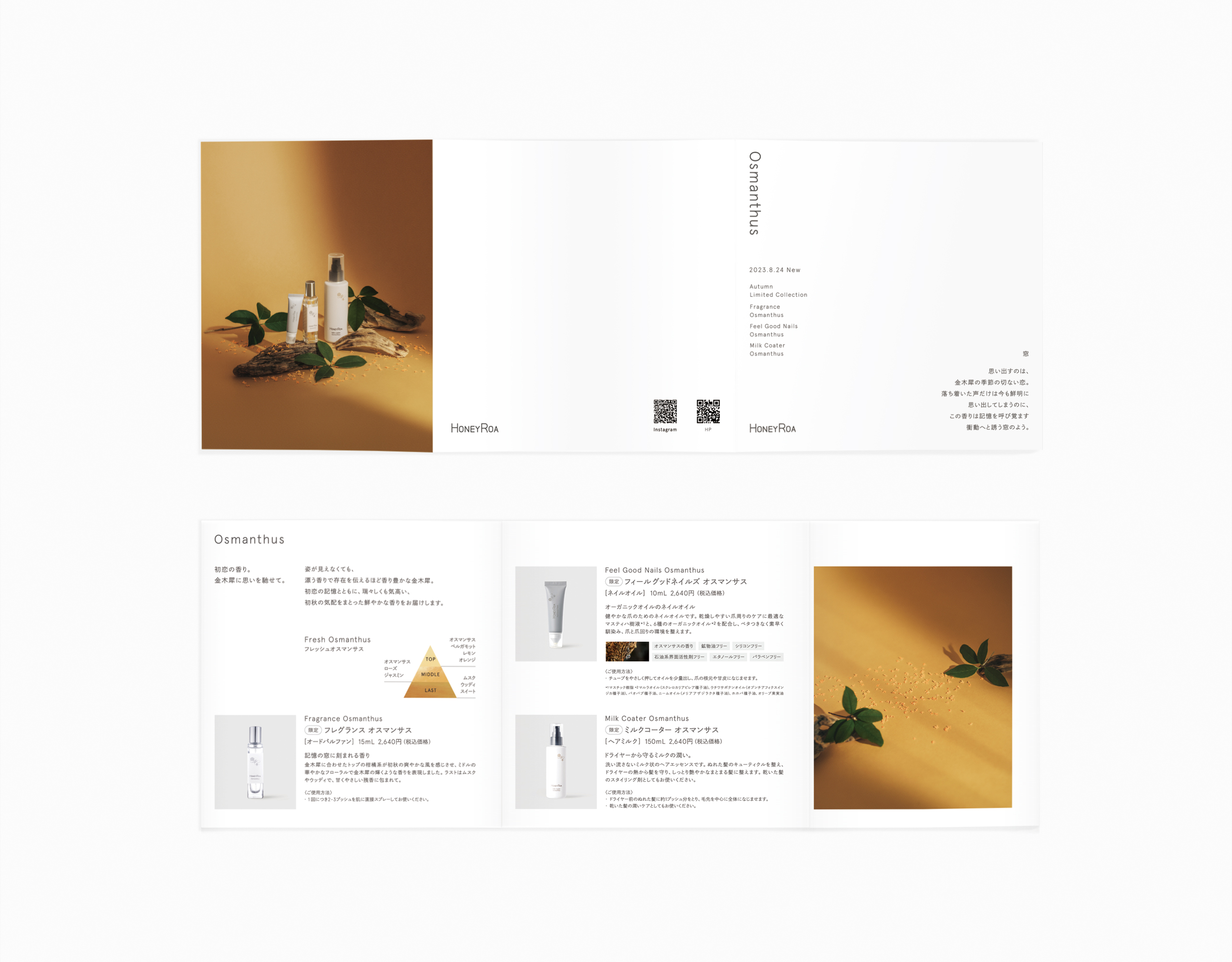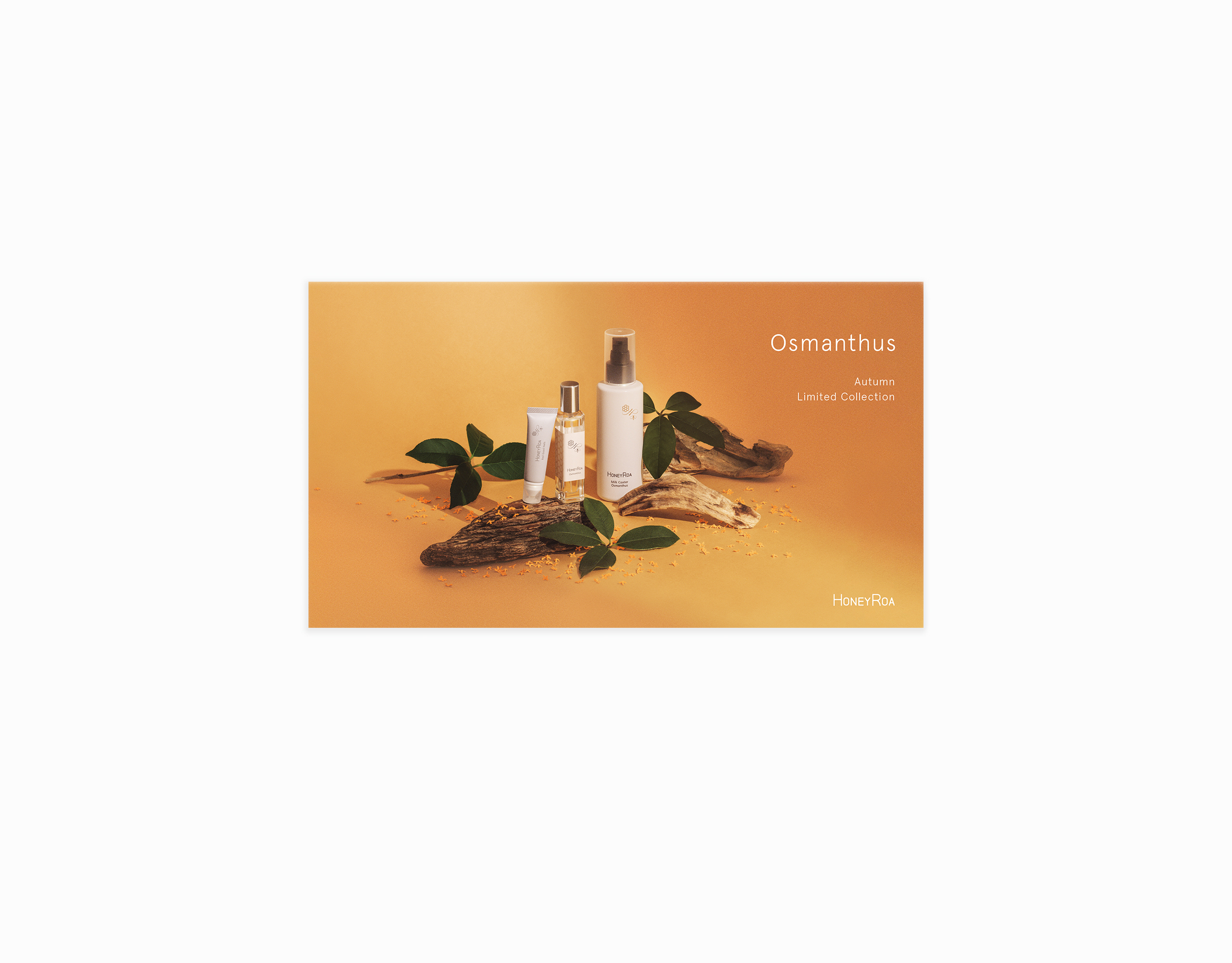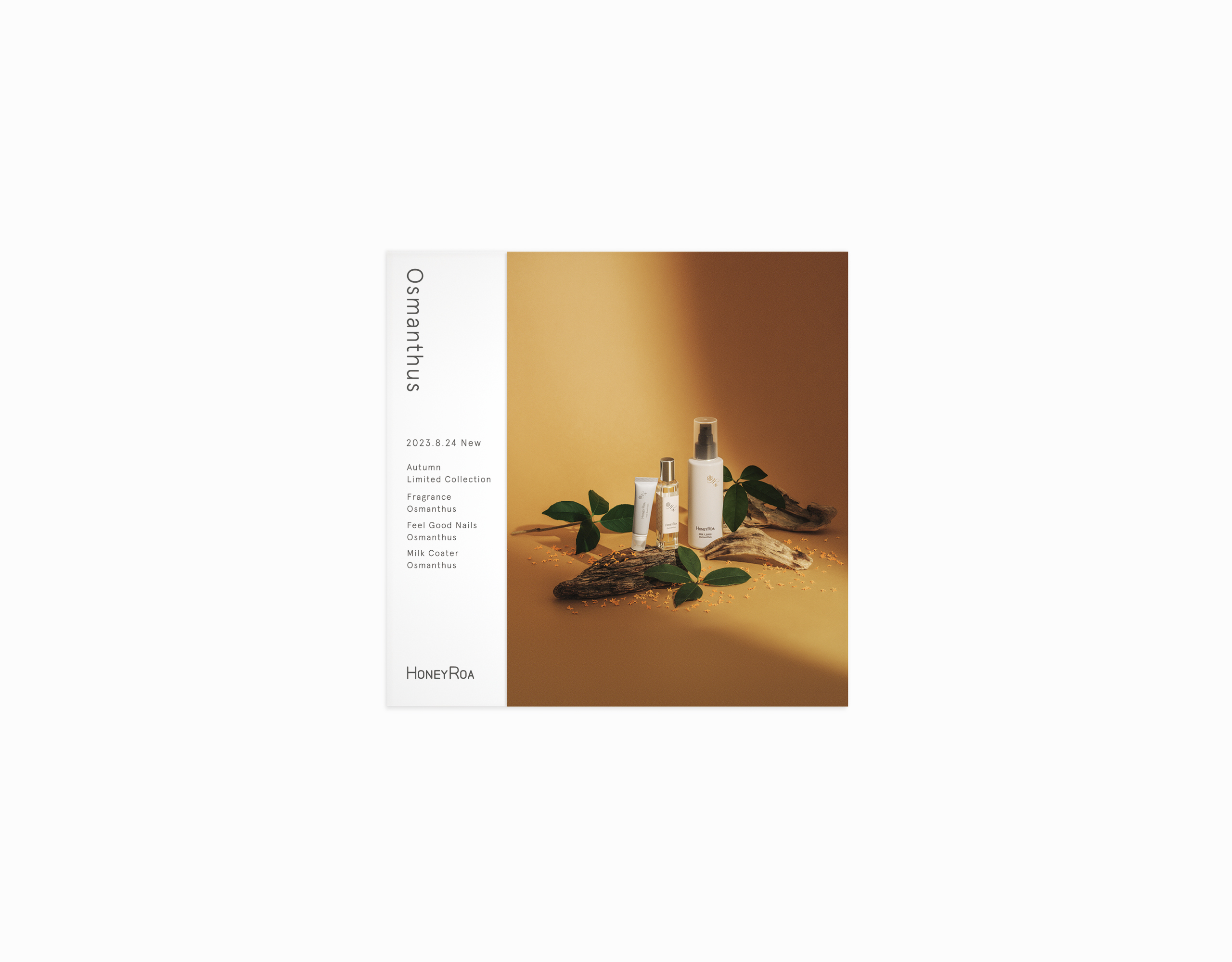 蜂蜜を使った化粧品やナチュラルなライフスタイルを提案するブランドHONEY ROA(ハニーロア)。秋季限定コレクション『Osmanthus(オスマンサス)』のビジュアルディレクションとパンフレット、店頭コルトンのデザインを担当いたしました。
