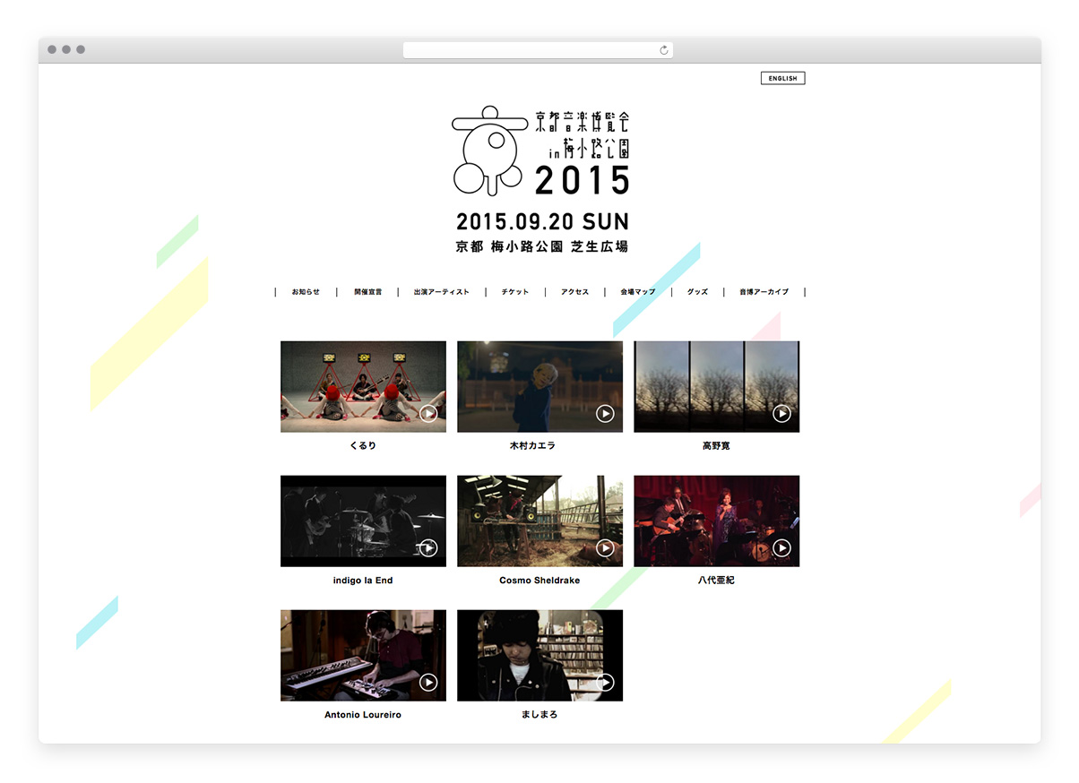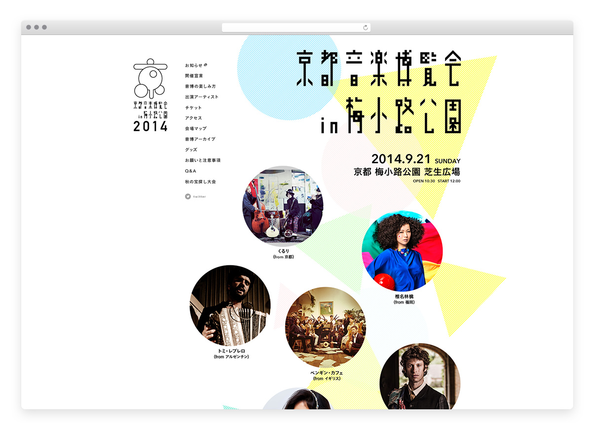 くるり主催で毎年京都・梅小路公園で開催されている「京都音楽博覧会」。2014年よりオフィシャルサイトのデザイン・運用を担当しています。