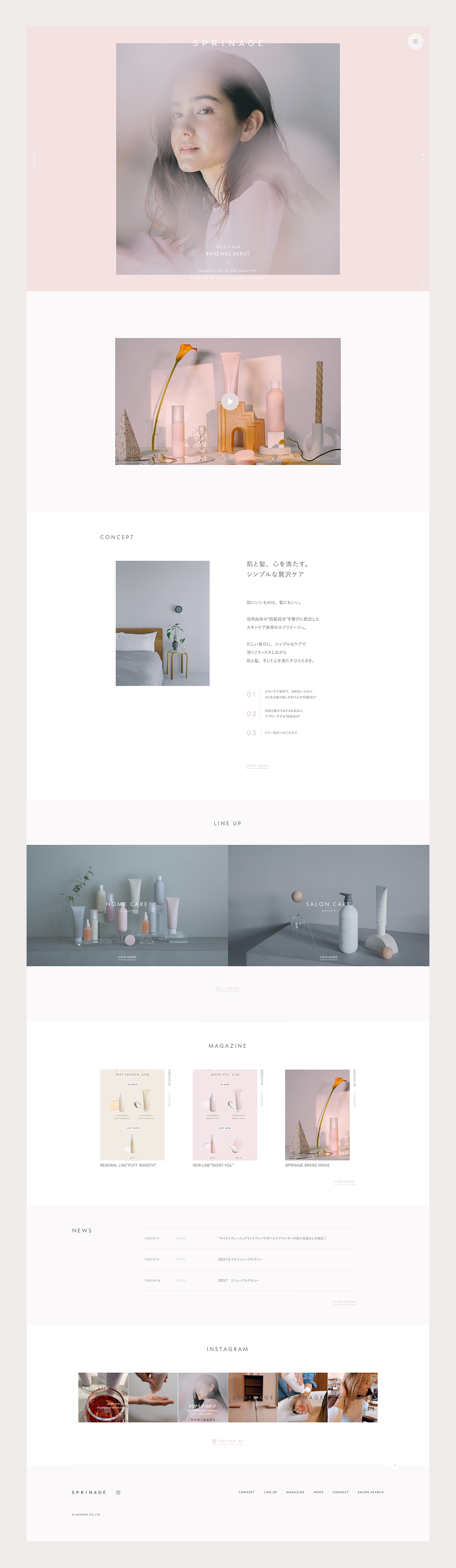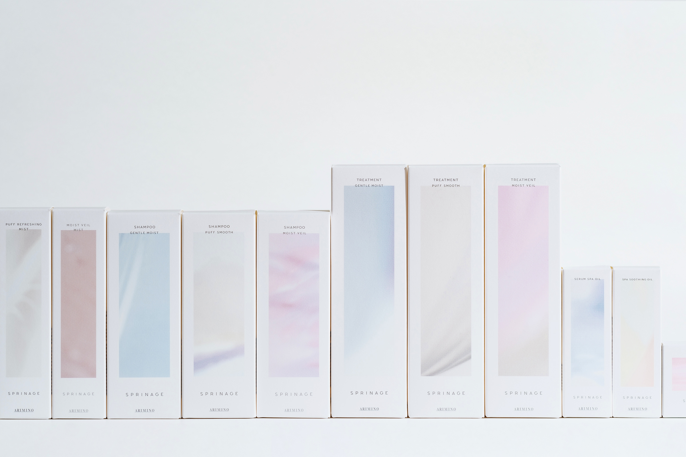 ヘア・スキンケアブランド『SPRINAGE(スプリナージュ)』のリブランディング。シリーズ全体のパッケージデザイン・キービジュアルビジュアル・Webサイト・ブランドブック・販促ツールなどのデザインを担当いたしました。